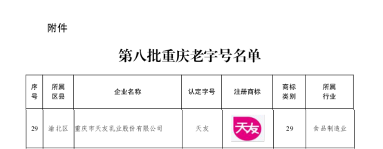 530,重慶市商務(wù)委員會正式發(fā)布了《關(guān)于認定第八批重慶老字號的通知渝商務(wù)〔2025160 ,市農(nóng)投集團所屬天友乳業(yè)天友品牌位列其中。